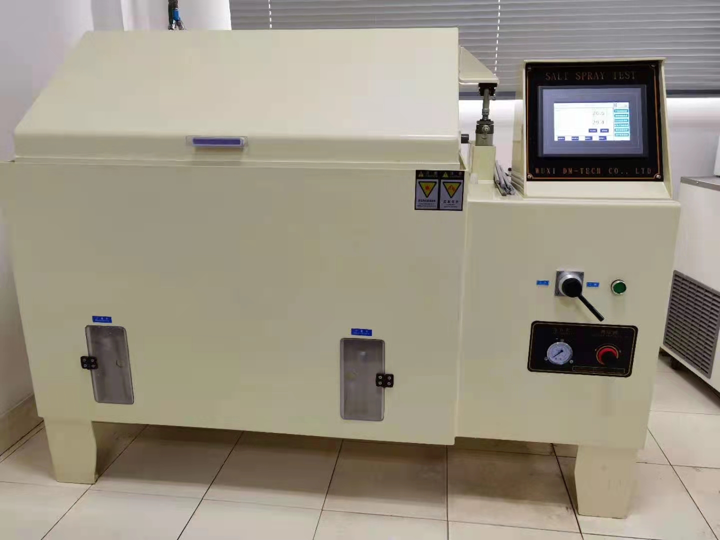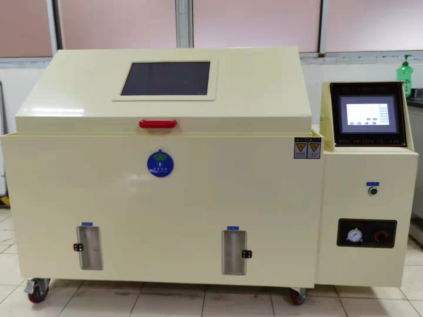 鹽霧試驗箱專門針對各種材質之表面,經油漆、涂料、電鍍、陽極處理后,測試其表面抗腐蝕能力。鹽霧試驗箱溫度波動為 ≤±1.0℃ 鹽霧沉降量為1~2ml/h/80cm² ,其特質錐型分散器,可調整噴霧之大小,并可使霧氣落霧平均,借空氣擠壓將霧氣排出 。箱蓋為錐形設計,成120℃頂角,有利于鹽霧產生的液滴不直接滴落咋在試樣上,保證了試樣的準備度。以及為了穩定的發揮其功能,性能,應具備 1.常年溫度為5℃~35℃的場所  2.相對濕度:不大于85% R·H.3 大氣壓:86~106kPa 3.周圍無強烈振動