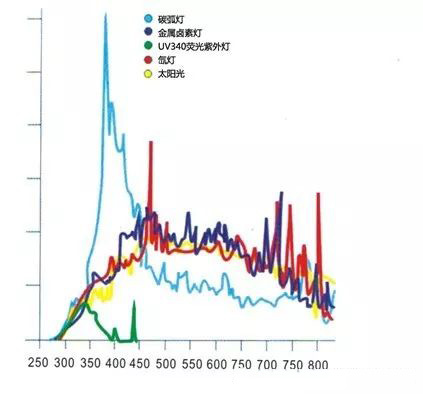 氙燈老化試驗是在實驗室中進行的。因為要模擬太陽光輻照,這就涉及到實驗室光源的選擇。目前,實驗室光源主要有碳弧燈、金屬鹵素燈、熒光紫外燈、氙燈等。下圖比較了太陽光及這幾種實驗室光源的光譜,可見,氙燈可以更貼切的模擬太陽光,是目前模擬性最好的一種人工光源,這也是氙燈老化試驗之所以成為高分子材料耐候性評價最常用測試評價方法的原因。