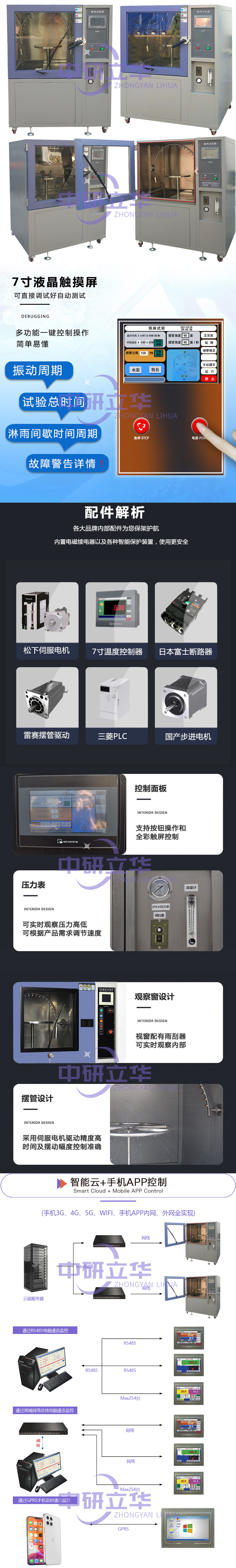 2.全儀表的控制系統以及變頻技術的采用,使得降雨量、試品架的回轉角度,噴水擺桿的擺動角度以及噴水量,擺動頻率都可自由設置及調節